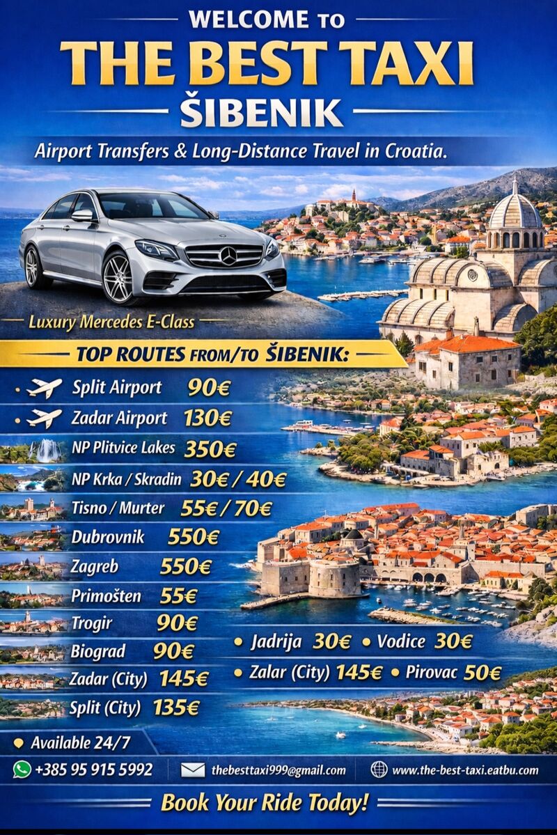 NAZOVI +385959155992The Best Taxi Šibenik - Vaš najpouzdaniji partner za sve potrebe prijevoza u Šibeniku i široj okolici. Nudimo vrhunsku uslugu taxi prijevoza dostupnu od 0-24 h svakim danom, osiguravajući da na svoje odredište stignete sigurno, udobno i uvijek na vrijeme.